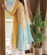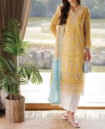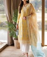 This 3-piece embroidered lawn uf-357 set includes a digital printed lawn shirt, dyed cotton trousers, and a digital printed chiffon