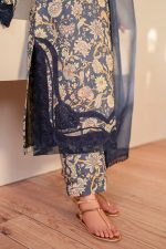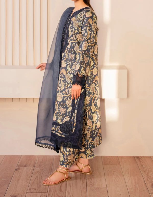 This 3-piece outfit includes a digital printed lawn front and back, trousers with an embroidered organza neckline patch, embroidered organza