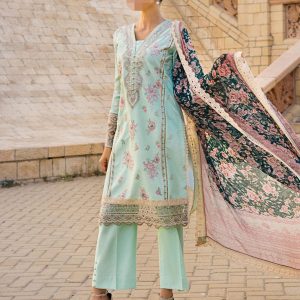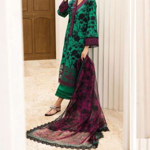 A green paisley shirt beautifully paired with a floral farshi shalwaar and styled with a silk dupatta. Digital Printed Silk